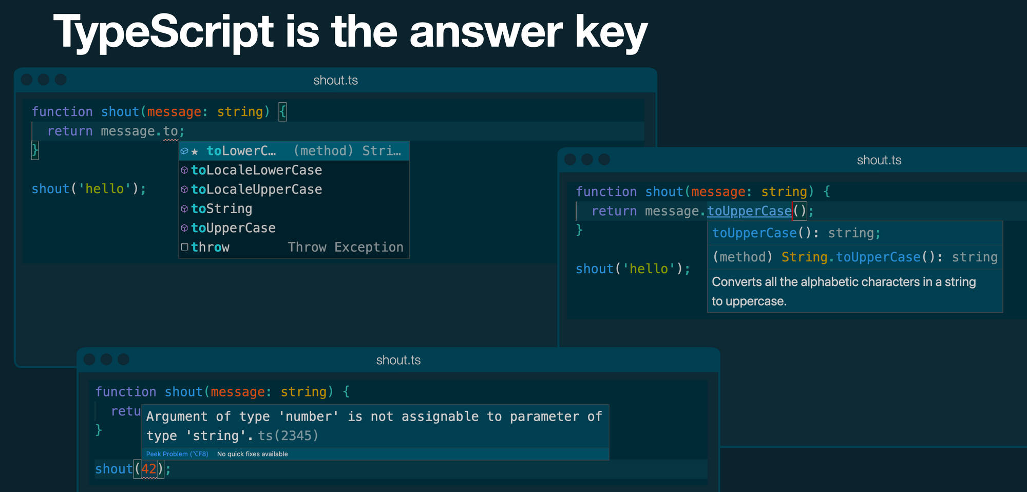 In other statically typed languages, the type system can feel like a gatekeeper. In TypeScript, it feels more like a messenger. While type-checking errors can be frustrating at times, they're almost always telling you useful information. "Don't shoot the messenger."